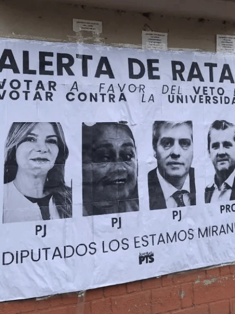 Los pasillos de varias facultades de la UNT aparecieron empapelados con un mensaje contundente: "¡Alerta de ratas! Votar a favor del veto es votar contra la universidad". Estudiantes de Filosofía y Letras, Artes y Ciencias Naturales utilizaron esta pegatina para presionar a los diputados nacionales de Tucumán, entre los que figuran Gladys Medina, Elia Marina Fernández, Agustín Fernández y Mariano Campero.