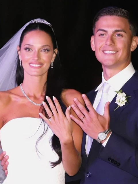 Sabatini deslumbró con un imponente vestido de novia blanco marfil diseñado por Dolce & Gabbana, complementado con un extenso y delicado velo de tul blanco con detalles bordados. Dybala, por su parte, lució un sofisticado traje de Battistoni, una sastrería italiana que le diseñó un modelo artesanal.