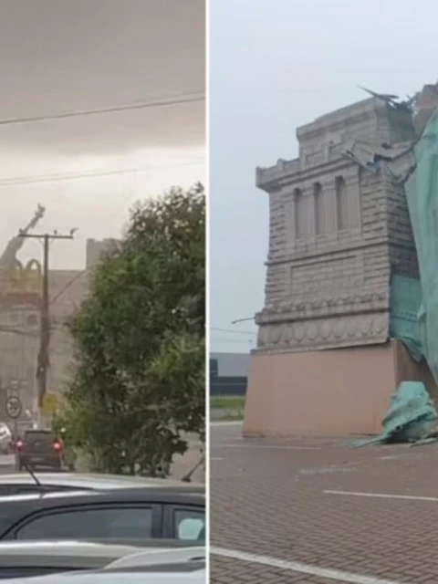 La caída de la estructura se produjo en el estacionamiento de una megatienda de la cadena Havan, uno de los puntos comerciales más concurridos de la zona. La estatua, que tenía 24 metros de altura más un pedestal de 11 metros, no resistió la fuerza del viento y terminó desplomándose en medio del temporal.