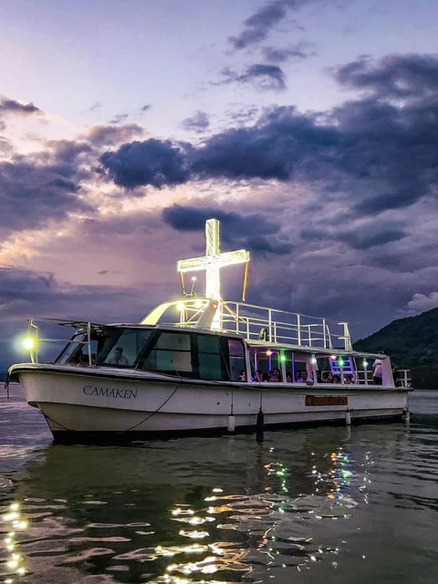 A bordo de un catamarán y rodeados por el silencio sereno del lago, los participantes navegaron guiados por la reflexión y la oración. Cada estación fue representada por familias de la zona, que con profundo respeto y entrega pusieron en escena los momentos clave de la Pasión de Cristo. Una ceremonia marcada por la fe colectiva, con fuerte carga simbólica y emocional.