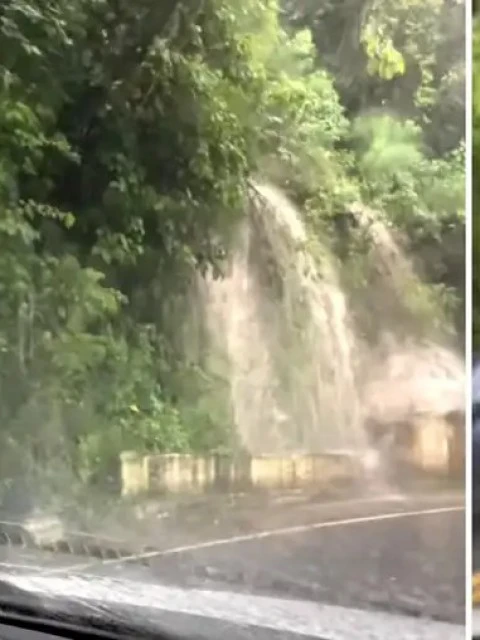 En el video se observa cómo el agua reduce la visibilidad al mínimo y genera cascadas naturales que atraviesan la calzada, elevando el riesgo para los vehículos.