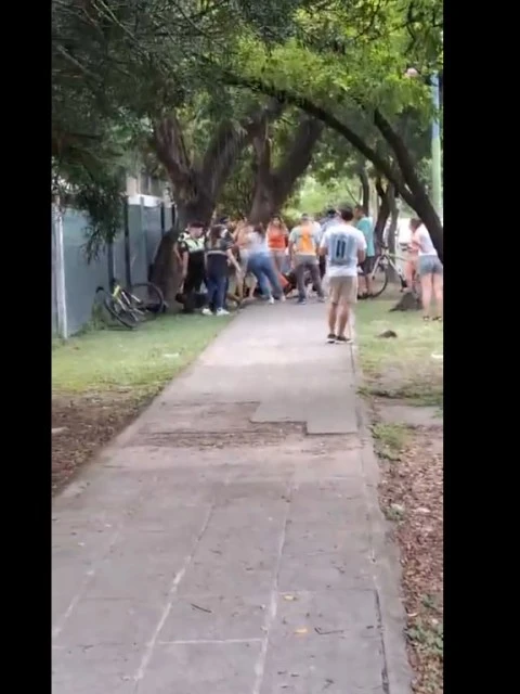 En un video que circula en redes sociales, se escucha cómo algunas personas intentan frenar la golpiza mientras otros continúan atacándolo. "¡Eh! ¡Ya está!", se oye en la grabación mientras el hombre es pateado contra un cantero y golpeado con un casco por una vecina.