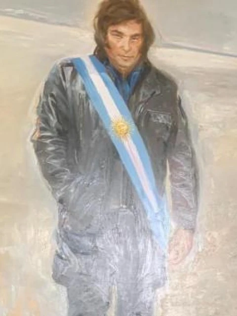 En medio de la polémica por sus recientes declaraciones en Davos, Milei se reunió con el diseñador Roberto Piazza y su pareja, Walter Vázquez, quien se define como "figura pública" en Instagram y se promociona como conductor y cantante. Vázquez, aparentemente también dedicado a la pintura, fue el autor de uno de los retratos que decoran la galería. En él, el presidente aparece con su icónica campera de cuero y la banda presidencial sobre un fondo blanco.