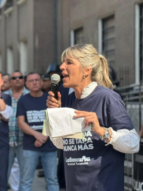 Durante la marcha de mujeres bancarias frente a Tribunales, Cecilia Sánchez Blas apuntó contra el Ministerio Público Fiscal y reclamó una justicia con perspectiva de género en la causa por abuso sexual que involucra a exjugadores de Vélez.