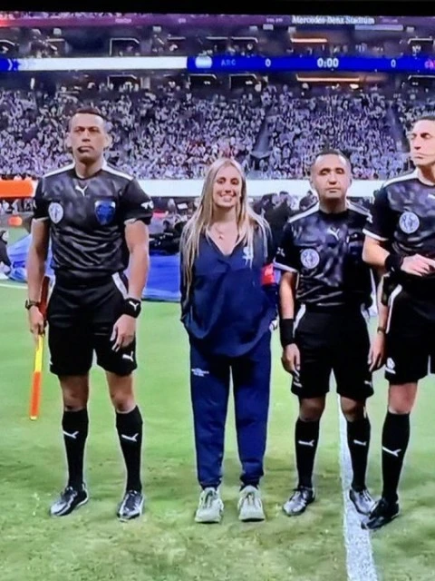 Antes de elegir la cara de la moneda, el señor diez la saludó con un beso en la mejilla y a los árbitros, les estrechó la mano. La aparición de la joven periodista de ESPN rápidamente revolucionó las redes y todos preguntaban lo mismo: ¿qué hacía ahí?
