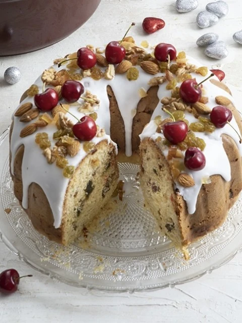 En un bowl colocar el azúcar impalpable y agregar poco a poco el jugo de naranja hasta obtener la consistencia de un glasé semi duro. Cubrir el budín. Por último, decorar con frutas secas extras, cerezas frescas y hojas de menta.