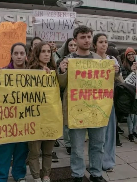 Los residentes del Garrahan -considerado el hospital pediátrico de mayor complejidad del país- vienen reclamando hace más de un año por salarios dignos y mejores condiciones de trabajo. Denuncian que un médico de primer año cobra menos de $800.000, pese a trabajar entre 60 y 70 horas semanales y realizar hasta seis guardias de 24 horas por mes.