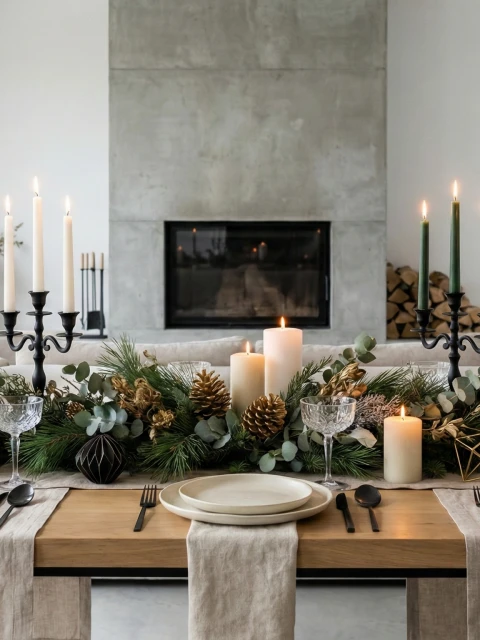 La iluminación se vuelve protagonista. Velas de distintos tamaños, tonos cálidos y candelabros simples reemplazan a la luz blanca de techo. En muchas mesas se combinan con guirnaldas de luces tenues, logrando una atmósfera cálida e íntima.